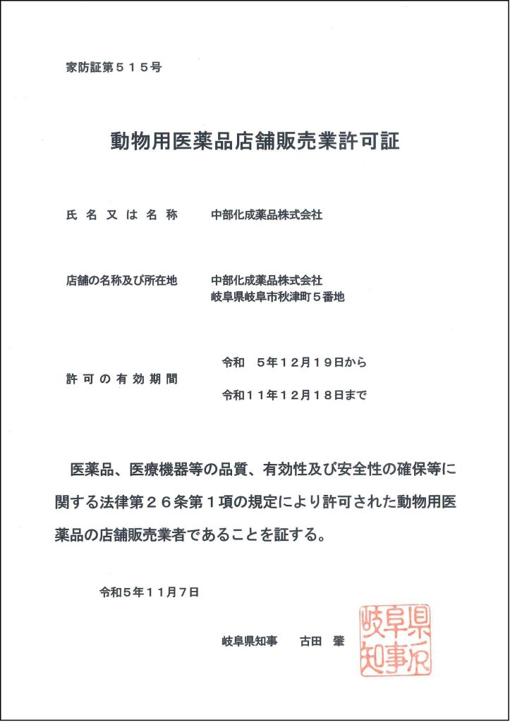 令和5年9月29日に改正されました動物用医薬品等取締規則に従い、弊社の「動物用医薬品店舗販売業許可証」を掲載いたします。